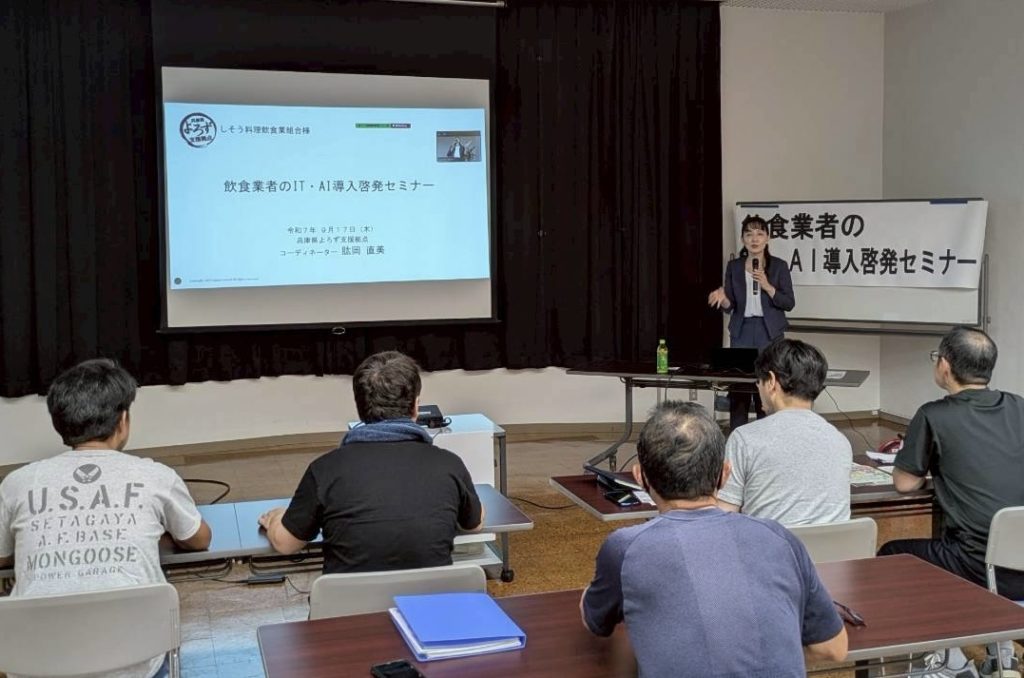続く第2部では、兵庫県よろず支援拠点コーディネーターの肱岡直美氏を講師に迎え、 「飲食業者のIT・AI導入セミナー」 を開催。